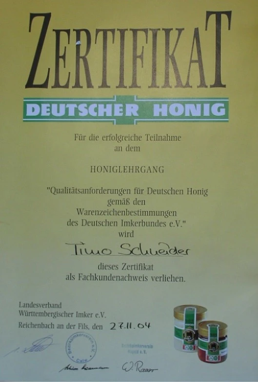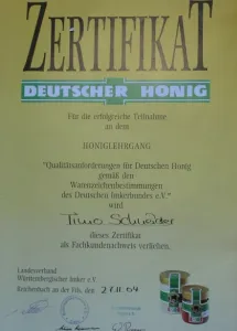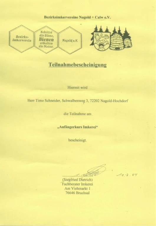 Im gleichen Jahr belegte ich den Anfängerkurs (10.07.), sowie den Wachskurs (13.11.) und den Honiglehrgang (27.11.) jeweils unter der Leitung von Siegfried Dietrich von der UNI in Hohenheim.